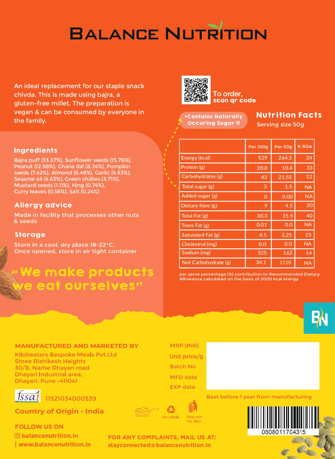 An ideal replacement for our staple snack chivda. This is made using bajra, a gluten-free millet. The preparation is vegan & can be consumed by everyone in the family. Ideal for weight watchers, diabetics & also those with hormonal imbalances.