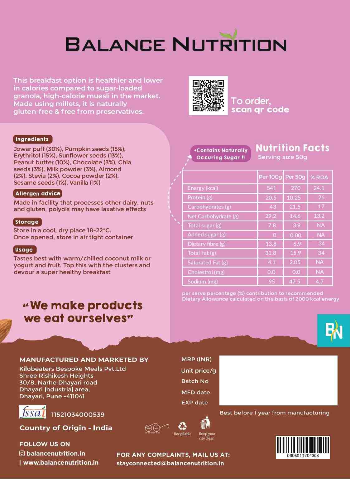 A low-calorie, sugar-free, and healthier breakfast cereal made with premium cocoa. Crafted using jowar (a gluten-free millet) and heart-healthy nuts & seeds, this cereal delivers great taste with balanced nutrition. It contains 50% fewer calories compared to regular muesli or other chocolate cereals, making it ideal for a mindful eater.